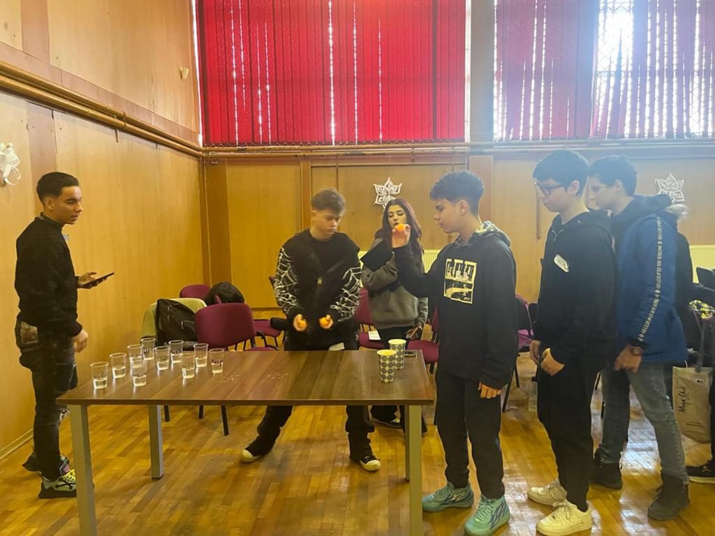 Intr-un interval de timp prestabilit, fiecare membru al echipei trebuia sa arunce cu mingiute de ping-pong la tinta in pahare pline cu apa pe jumatate. 🙂 Cu cat mai multe pahare nimerite, cu atat mai bine pentru echipa.