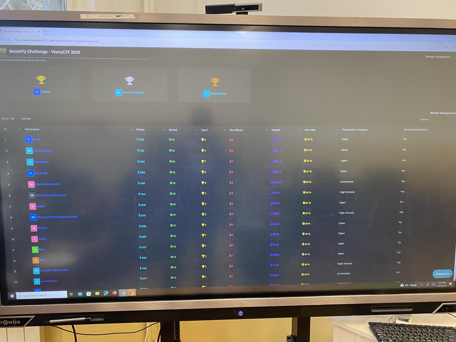 De la ora 9:30 pana la 16:30 a avut loc VianuCTF 2025, editia a III-a. Un super concurs de cybersecurity, organizat de Vianu Cybersecurity Club (Matei Ferseta presedinte).