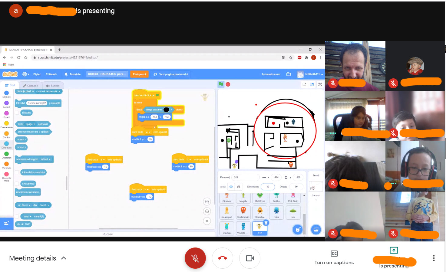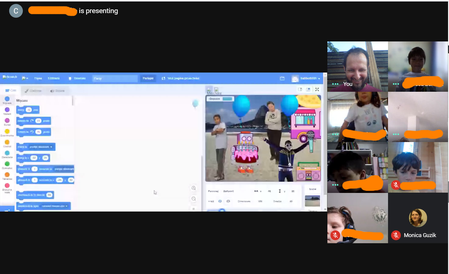 Inițial, copiii au fost în canalul principal de Google Meet, unde Monica Guzik le-a arătat câteva mișcări în Scratch, după care ei au testat fiecare pe calculatorul lui și arătau ce au inventat, după care fiecare copil s-a dus în canalul Alianței lui, să lucreze împreună cu restul echipei și mentorul asignat.