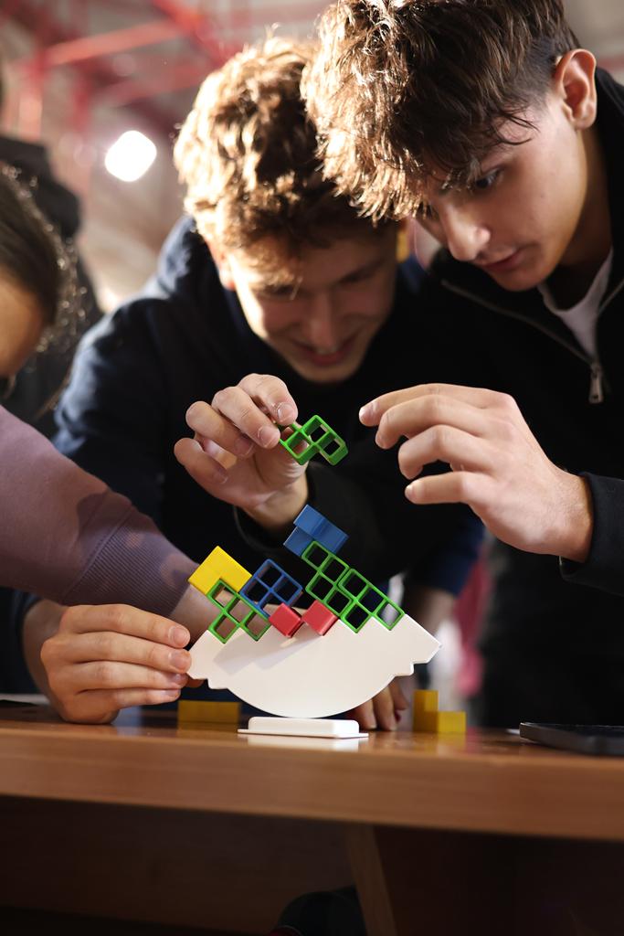 Proba Tetra Tower Balance – echipele trebuiau sa faca o constructie cu cat mai multe caramizi, in conditii de instabilitate, lucru in echipa, stres crescator pe scara exponentiala… Cand sa te opresti, cand sa risti si sa mergi mai departe.