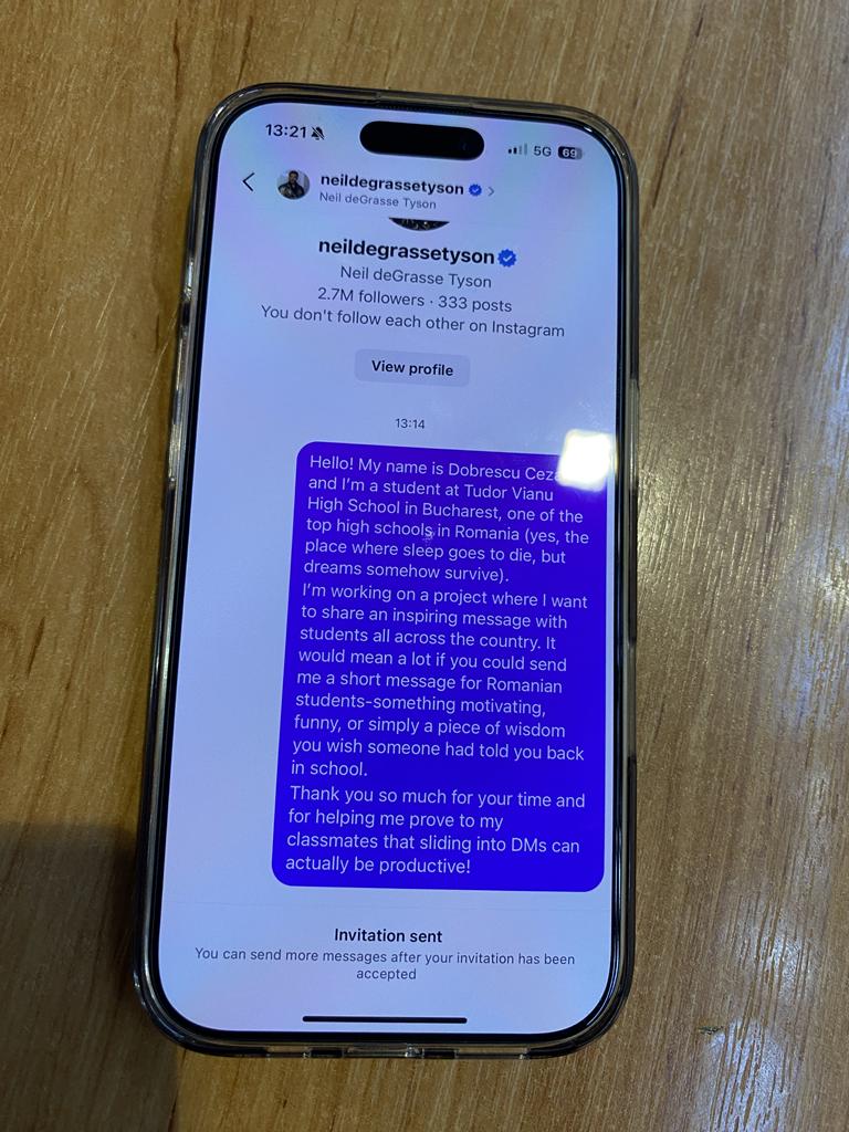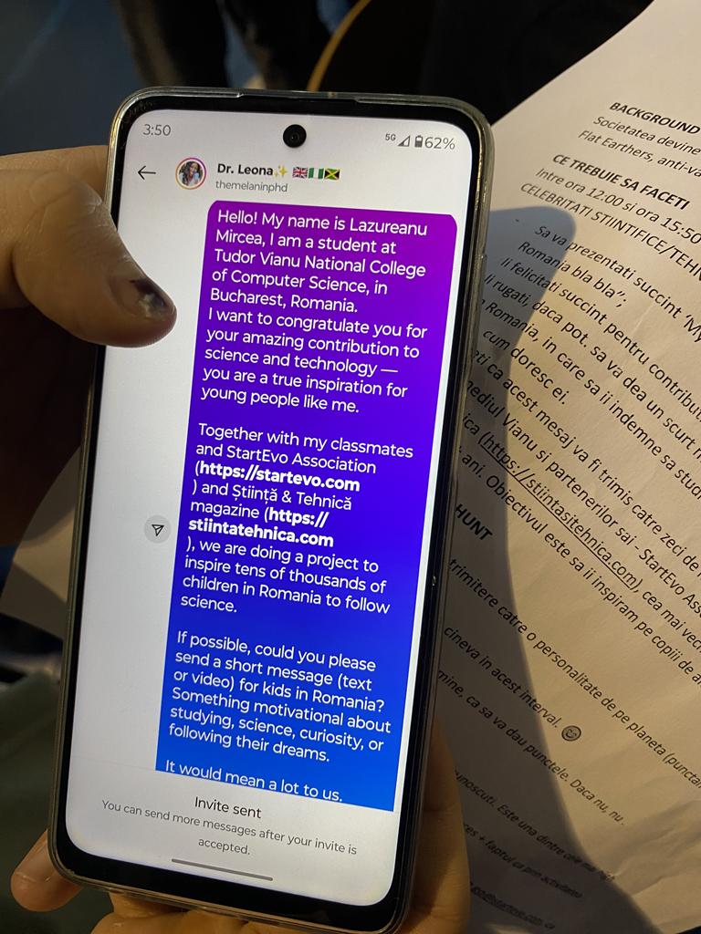 Alta, de interactionat cu VIP-uri pe stiinta si tehnica la nivel planetar, prin care sa ii roage pe acestia sa dea un mesaj inspirational pentru copiii din Romania. Unii, saracii, precum Neil deGrasse Tyson, Michio Kaku, Vitaly Buteric, au primit mesaje de la mai multe echipe :). Partea tare este ca am primit si raspunsuri inspirationale de astfel de VIP-uri in cele 4 ore cat a durat provocarea.