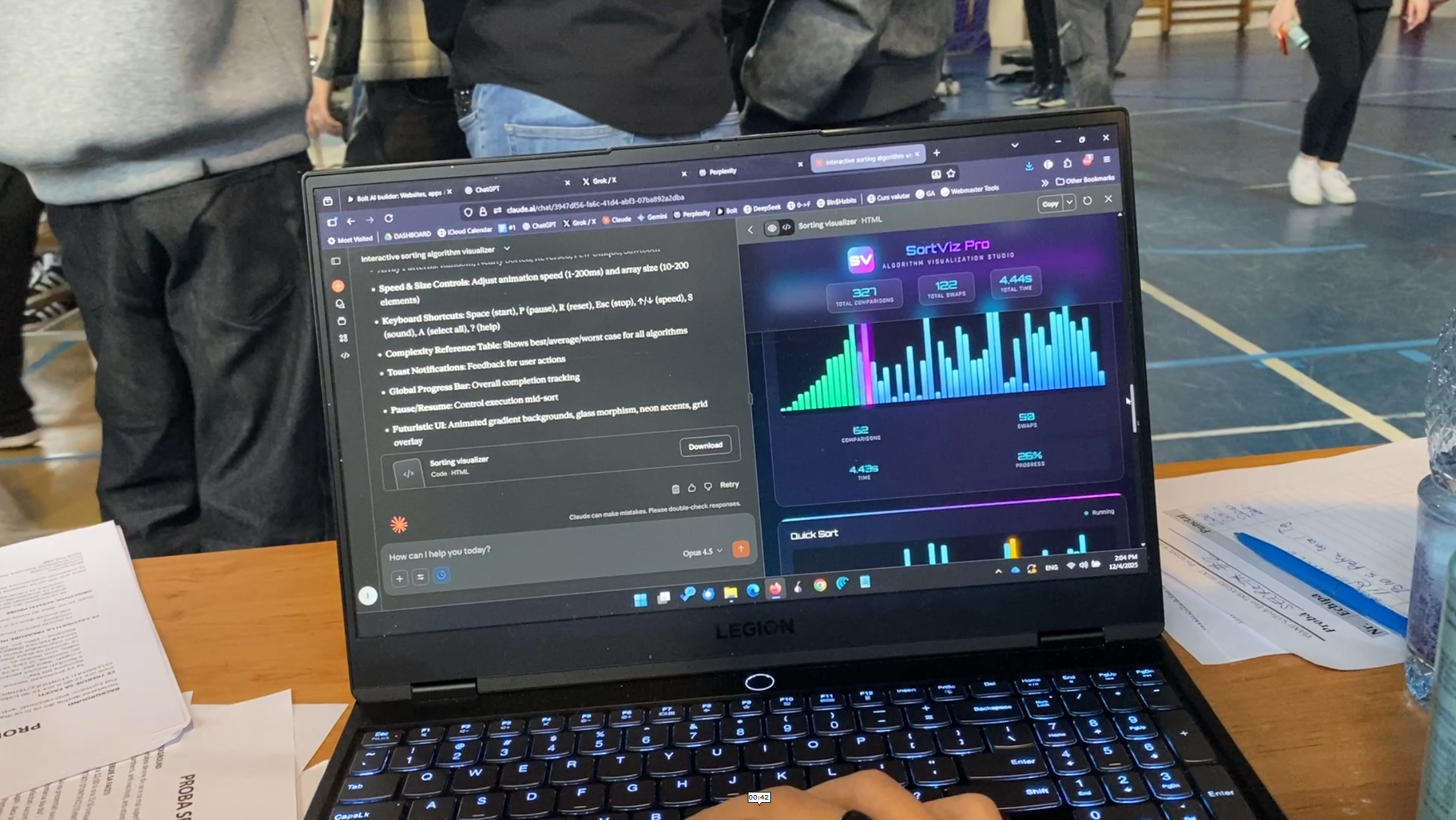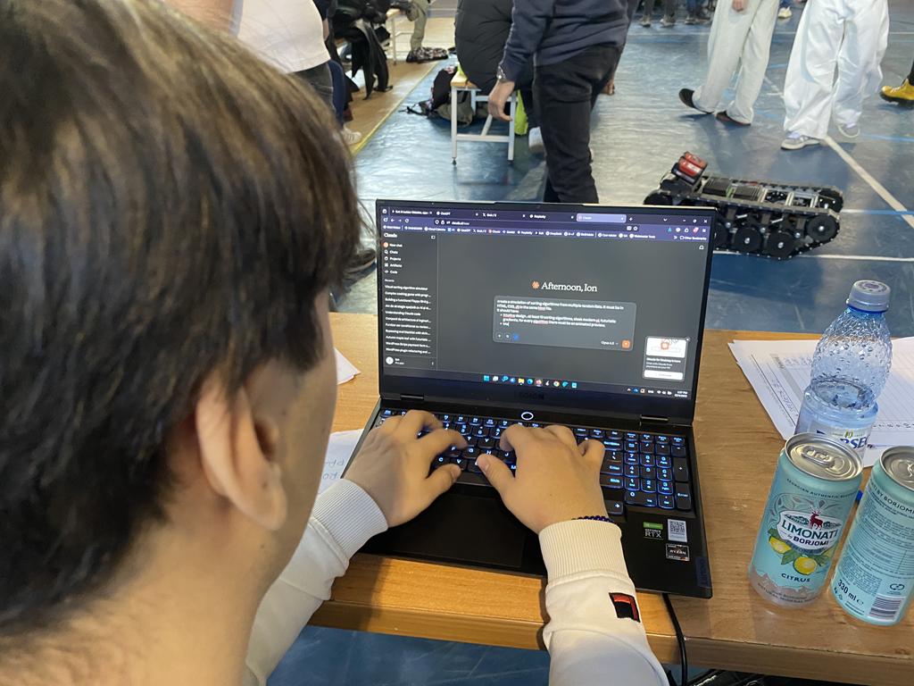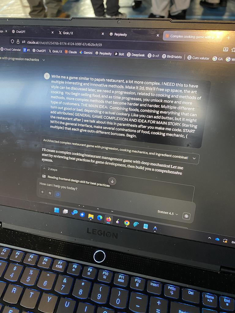Proba AI VIBE CODING – am picat pe jos. In 10 minute copiii trebuiau sa faca un joc, aplicatie sau site – ce vroiau ei, dar sa fie un demo cat de cat functional. Aveau la dispozitie 6 tool-uri (ChatGPT, Claude, Bolt, Gemini Antigravity, Grok, Perplexity, unele premium), 10 minute si 3 prompturi ca sa creeze ceva WOW. Chiar a fost WOW. Am avut modele matematice pe care nu le intelegeam, fizica hard-core, aplicatii superavansate de business alimentar, si altele asemenea. Am avut si cateva mai simple, gen snake, flappy bird reinvent. Dar calitatea gandirii din spatele prompturilor – nota 10.