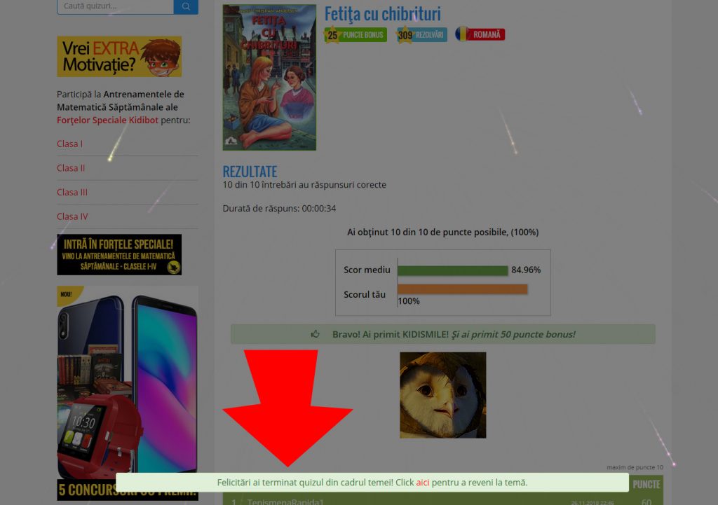 O să punem la statistici să vedeți exact ce utilizatori au rezolvat corect ce quizuri anume. Mai mult decât asta, aceasta statistică va fi disponibilă tuturor copiilor din echipă și părinților lor, astfel încât să fie presiune social pozitivă. „Ia uite, Ionică a rezolvat 4/5, eu am rezolvat 2/5. Trebuie să trag mai tare!”