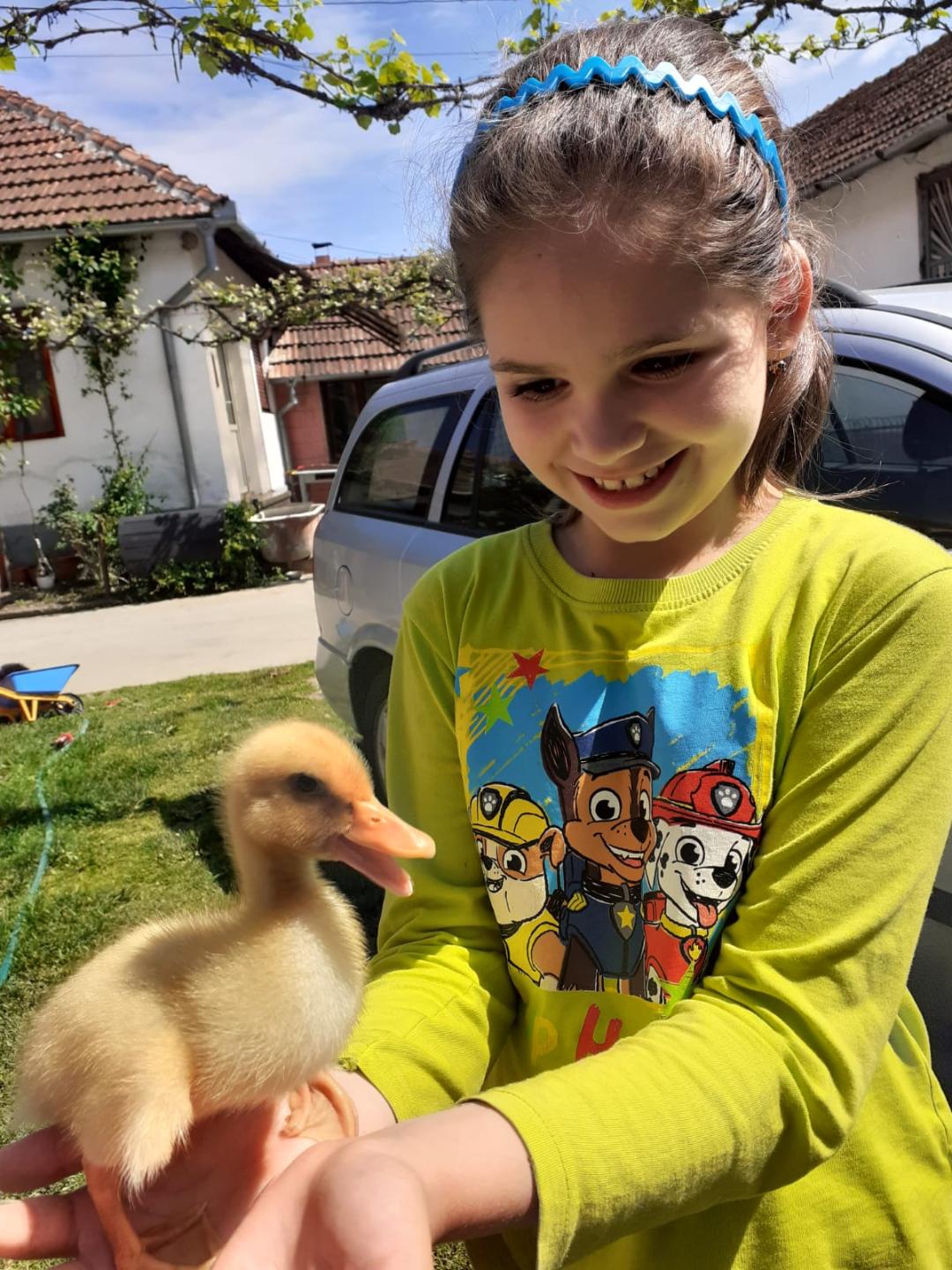 Am fost la tara si am hranit animalele: puisorii de gaina, ratustele, iezisorii la care le-am dat laptic, vitelusul, catelul si pisicile. De asemenea, la toate acestea am fost spijinita de parintii mei si prietenii mei de la tara, bineinteles nu a lipsit bunica mea.
