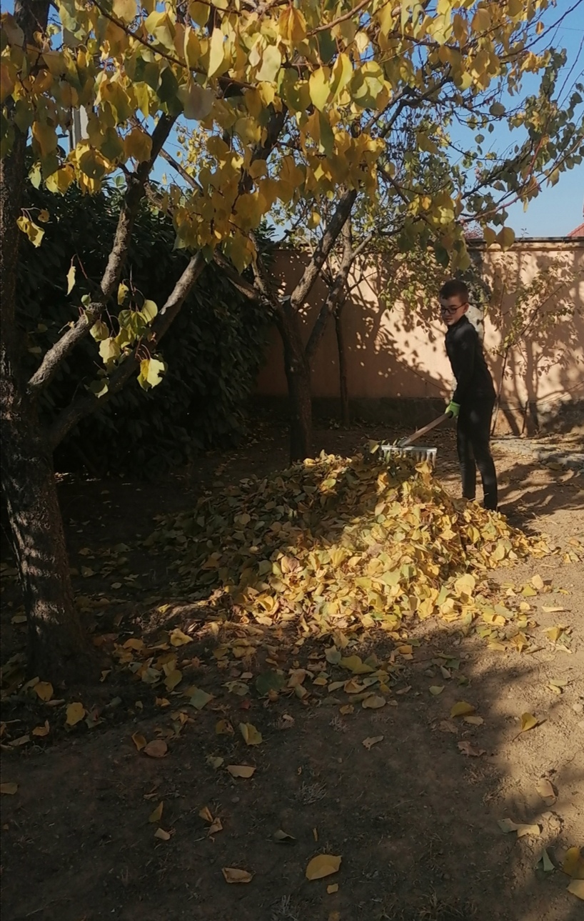 Dupa ce toamna a scuturat frunzele copacilor, acum covorul de frunze trebuie strans. Am făcut gramezi de frunze, iar tata le-a pus in saci.