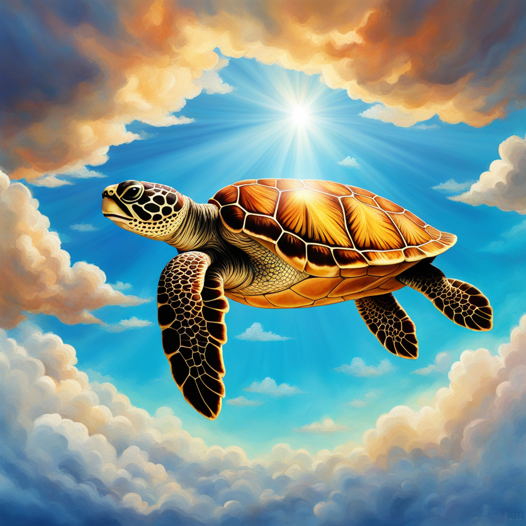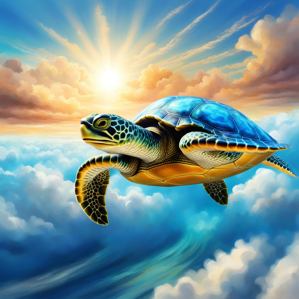 În fundal, cerul este vast și deschis, sugerând libertatea și posibilitățile nelimitate pe care le poate experimenta broasca țestoasă în zborul său.