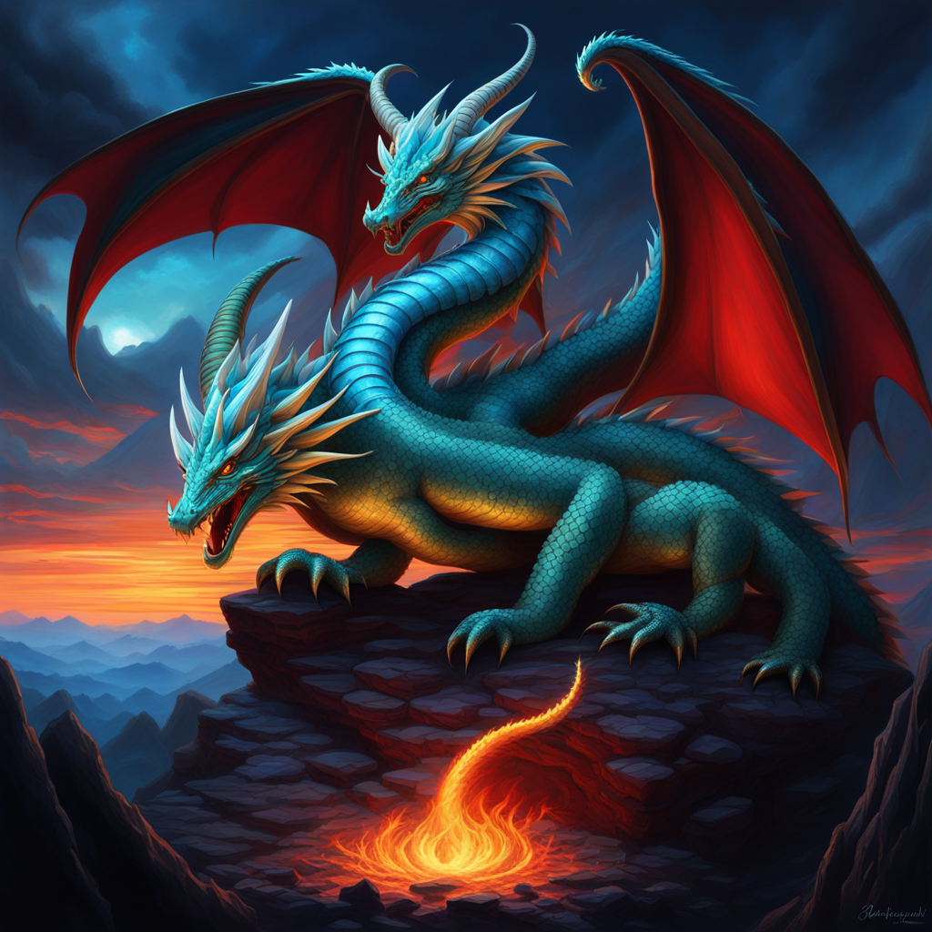 Imaginea prezintă o scenă dramatică și fascinantă cu un dragon, denumit Dragonix, pe vârful unui munte în timpul orelor crepusculare. Dragonix este o creatură impunătoare, cu solzi strălucitori de culoare închisă care se îmbină cu nuanțe de albastru, negru și roșu. Aripile sale mari și puternice sunt întinse, cu membranele luminoase și translucide care strălucesc în lumina apusului.