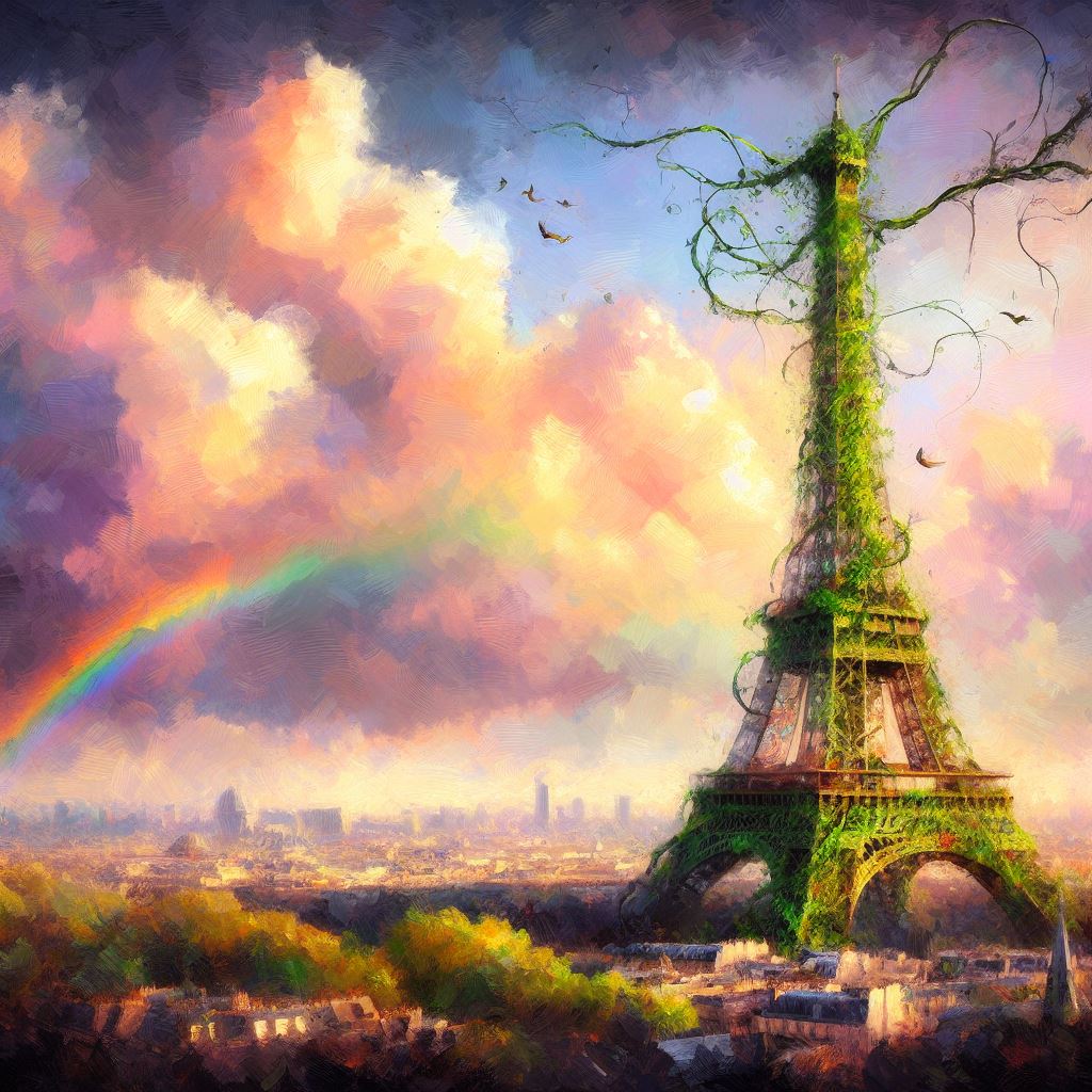 Imaginea prezintă o scenă impresionantă și onirică a Turnului Eiffel, combinată cu o plantă ciudată care se ridică către cer. Pictura este realizată în acuarelă, conferind o calitate ușoară și delicată întregii scene.