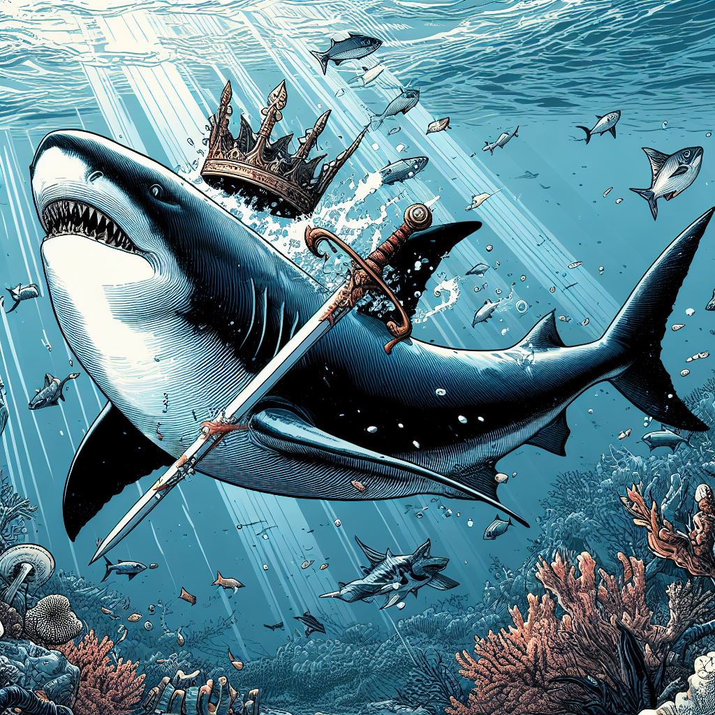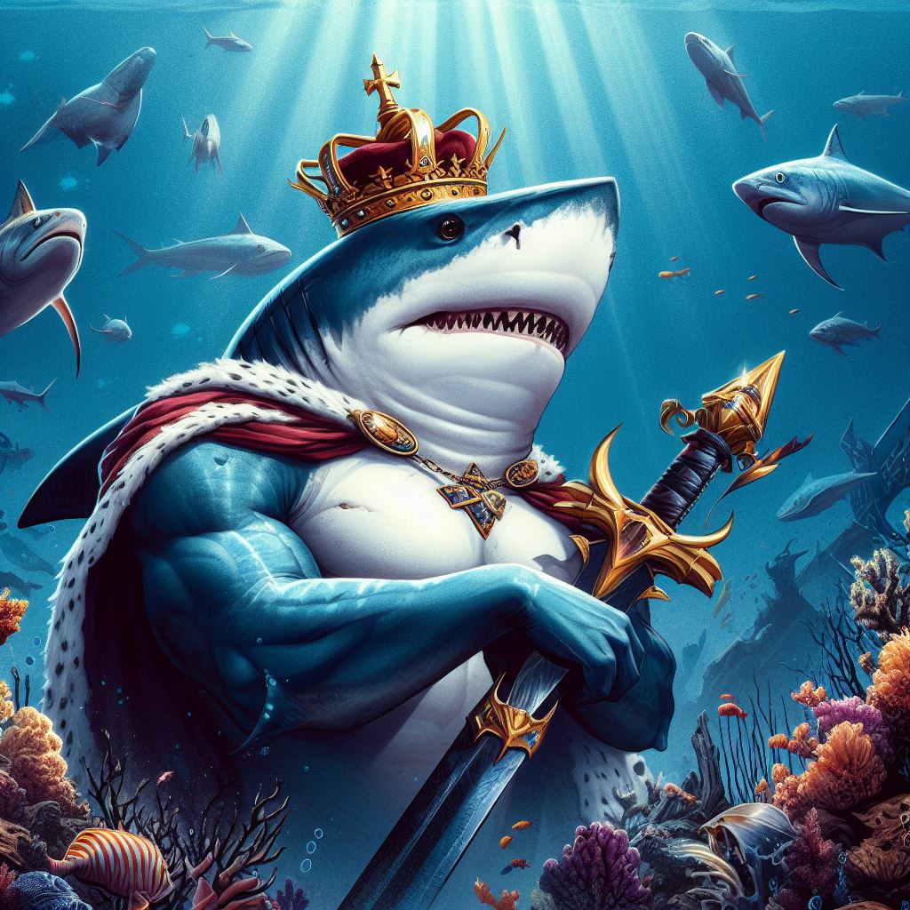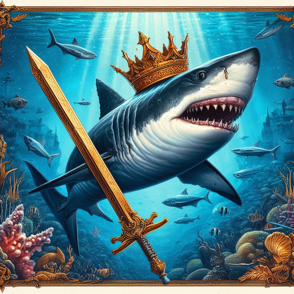 Imaginea înfățișează un peisaj subacvatic impresionant și misterios. În centrul scenei, un rechin uriaș, cunoscut drept Împăratul din adâncuri, domnește cu autoritate asupra unui regat subacvatic. Acesta poartă o coroană strălucitoare pe capul său masiv, iar solzii săi au reflexii irizante în lumina albastră a adâncurilor.