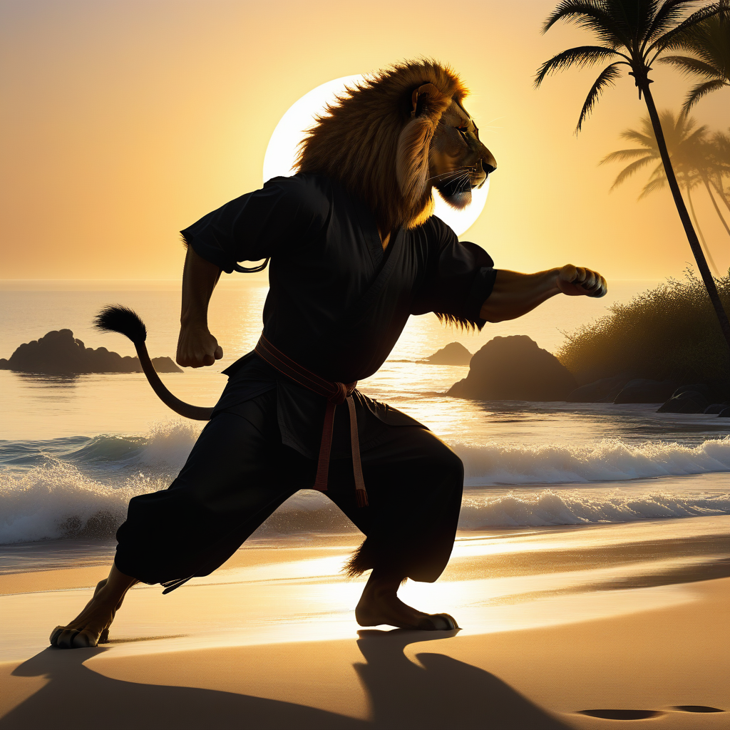 Imaginea intitulată “Kung Fu King” prezintă un leu îmbrăcat într-un costum clasic de luptător Kung Fu, antrenându-se în mijlocul unei străzi dintr-un decor tradițional chinezesc. Leul, cu blana sa aurie strălucitoare și coama impunătoare, este întruchiparea unei figuri regale și puternice.