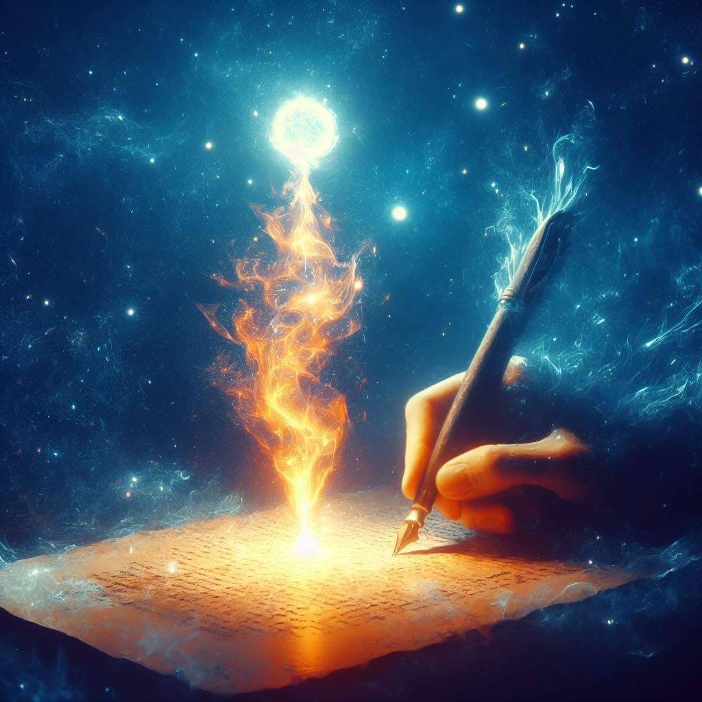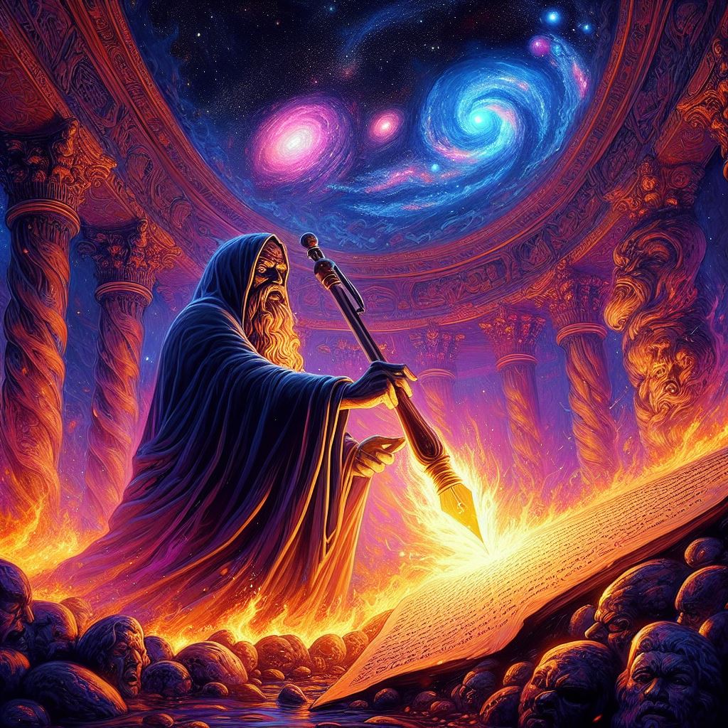 Hârtia este un pergament cosmic, iar flăcările care o înconjoară nu o ard, ci o transformă. Cuvintele scrise de penița cosmică nu sunt doar mesaje, ci și incantații. Ele pot crea sau distruge, pot aduce lumină sau întuneric. Când privim tabloul, simțim că suntem martorii unui act de creație divină.