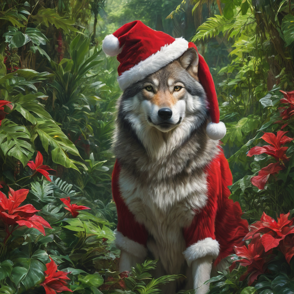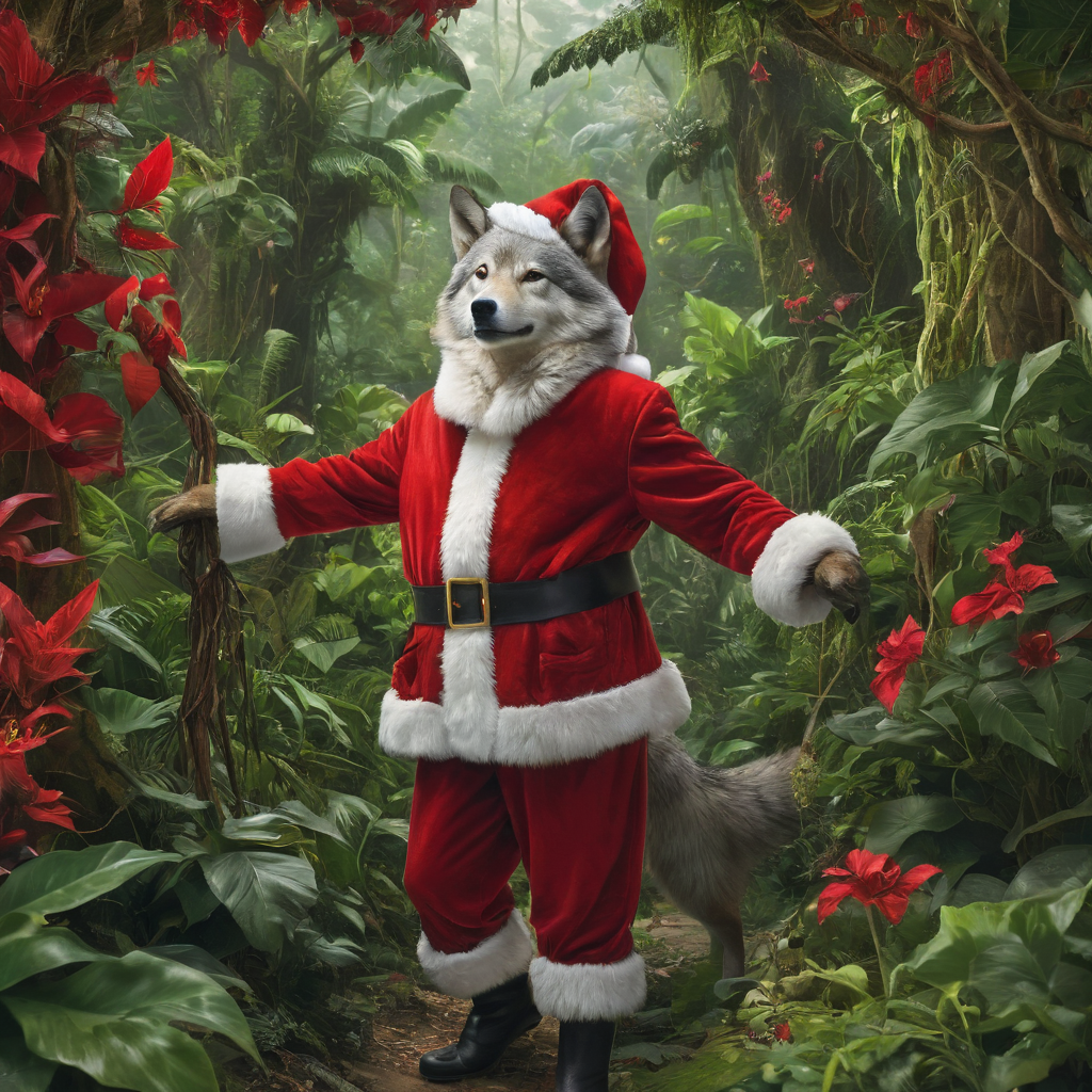 Imaginea intitulată “Santa Paws” prezintă o scenă neobișnuită și amuzantă în care un lup este îmbrăcat ca Moș Crăciun și se află în mijlocul unei junglă exotice. Această imagine combină elemente de fantezie și sărbători într-un cadru natural neobișnuit.